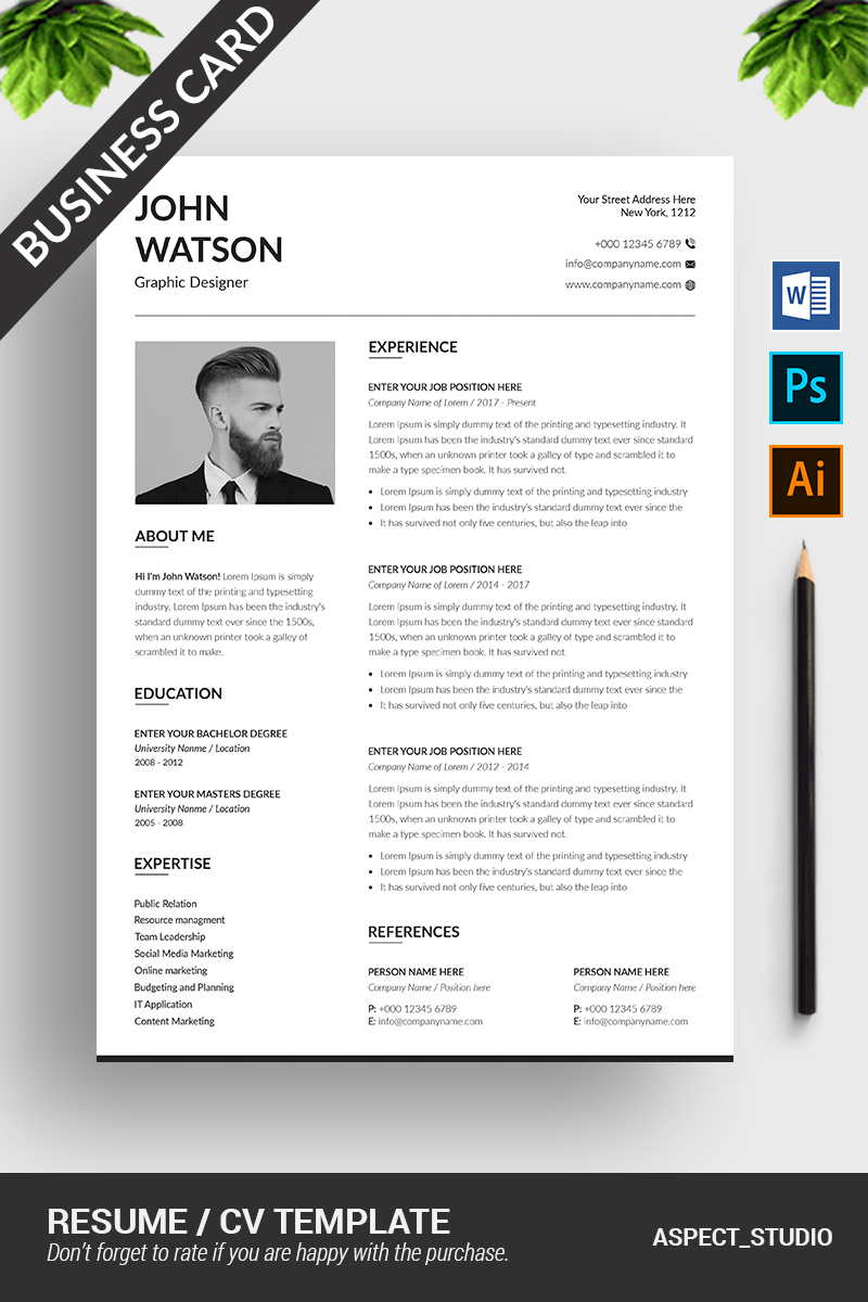 Download Резюме "John Watson with Business card Resume Template" / John Watson with Business card Resume Template - Резюме на тему графика 1,page,resume,2,a4,blue,clean,cover,letter,creative,cv,template,design,document,infographic,microsoft,word,minimalist,modern,photoshop