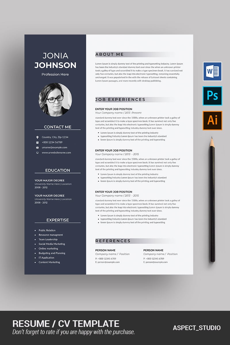 Download Резюме "Jonia Johnson Resume Template" / Jonia Johnson Resume Template - Резюме на тему графика 1 page resume 2 a4 blue clean cover letter creative cv template design document infographic microsoft word minimalist modern photoshop