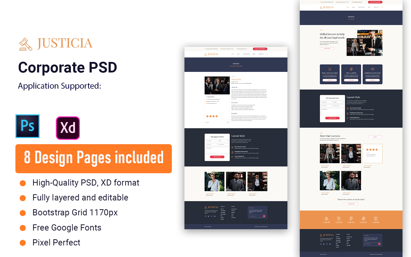Download PSD шаблон "Justicia super clean & modern Adobe Photoshop & Adobe XD PSD Template" / Justicia super clean & modern Adobe Photoshop & Adobe XD PSD Template - Адаптивный PSD шаблон на тему графика advisor,attorney,consulting,consulting theme,court,elementor,law,law firm,law office,law theme,lawyer,lawyer theme,legal,legal law website,legal services