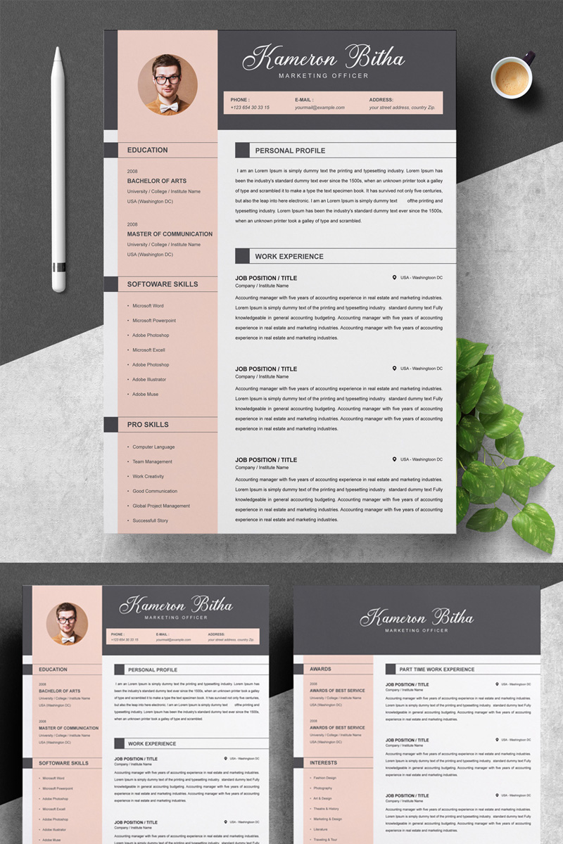 Download Резюме "Kameron Resume Template" / Kameron Resume Template - Резюме на тему графика 1 page resume 2 clean cv cover letter design template illustrator eps mac pages microsoft word modern photoshop psd professional