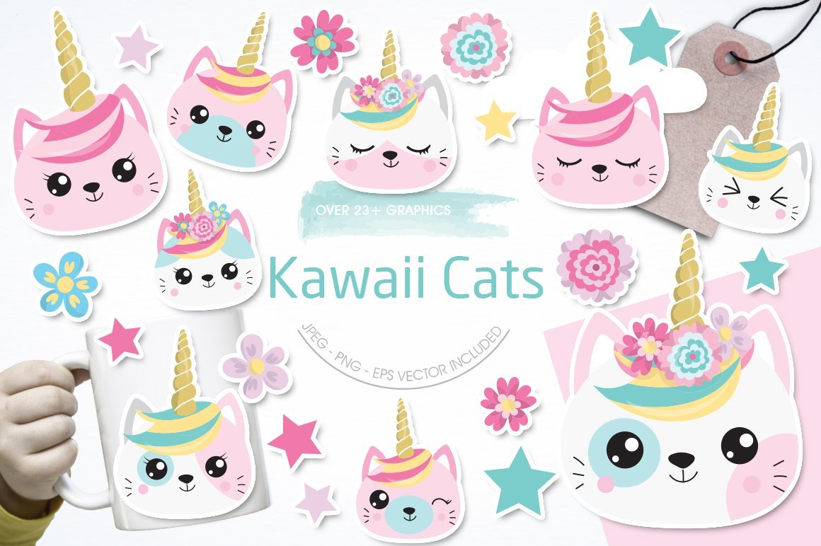 Download Vector "Kawaii Cats - Vector Image" / Kawaii Cats - Vector Image - Vector на тему графика scrapbook,scrapbooking,clipart,stars,clip art,flower,prettygrafik,cats,unicorn horn,vector art,cat head,kawaii cats