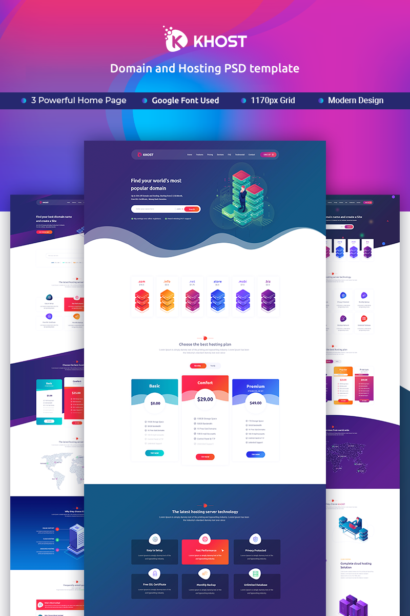 Download PSD шаблон "Khost Domain and Hosting PSD Template" / Khost Domain and Hosting PSD Template - PSD шаблон на тему доменный регистратор domain hosting cloud server psd templates trendy design trendy_design technology gradient psd_templates website