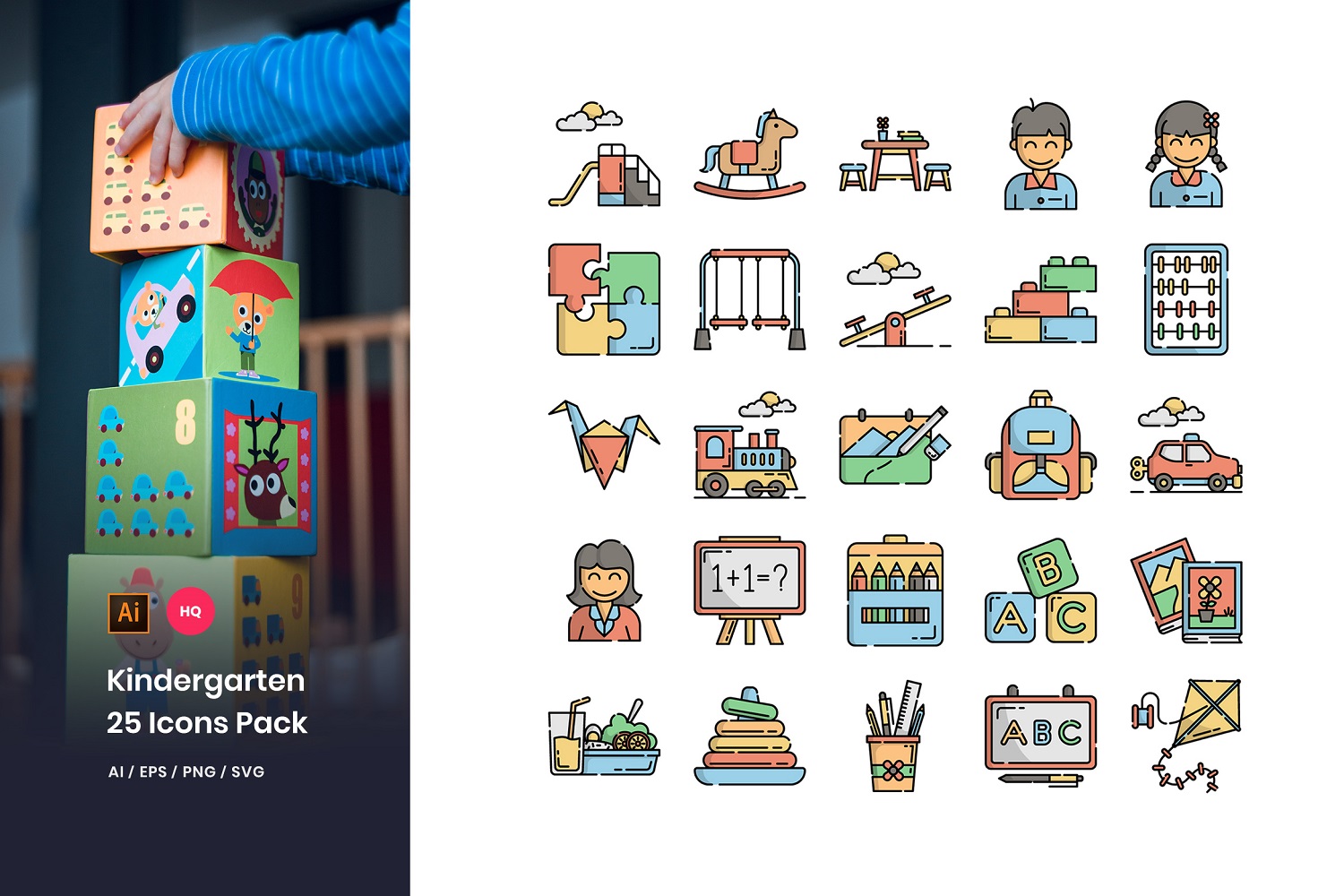 Download Набор иконок "Kindergarten Pack Icon Set" / Kindergarten Pack Icon Set - Набор иконок на тему графика icons,colorline,glyph,twotone,flat,yellowshadow,kindergarten,education,childhood,school,preschool,kids,classroom,playground,children
