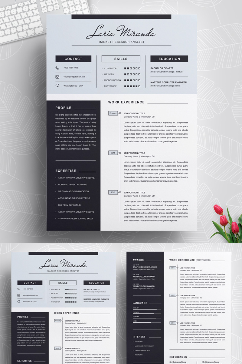 Download Резюме "Laria Resume Template" / Laria Resume Template - Резюме на тему графика 1 page resume 2 clean cv cover letter design template illustrator eps mac pages microsoft word modern photoshop psd professional
