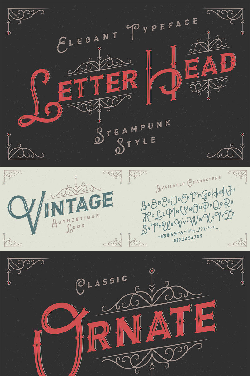 Download Шрифт "Letterhead Typeface with Ornate Font" / Letterhead Typeface with Ornate Font - Шрифт на тему графика font,type,typeface,vintage,ornate,classic,retro,old,elegant,letterhead,frame,style,text,vector,postcard,badge,steampunk,steam,punk,modern