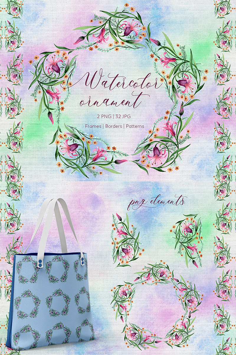 Download Иллюстрация "Lilies Ornament of Pink Flowers PNG Watercolor Set - Illustration" / Lilies Ornament of Pink Flowers PNG Watercolor Set - Illustration - Иллюстрация на тему графика watercolor illustration ornament pink drawing background lilies colorful drawn paint leaf plant wildflower seasonal foliage flower sprout stem textile botanical