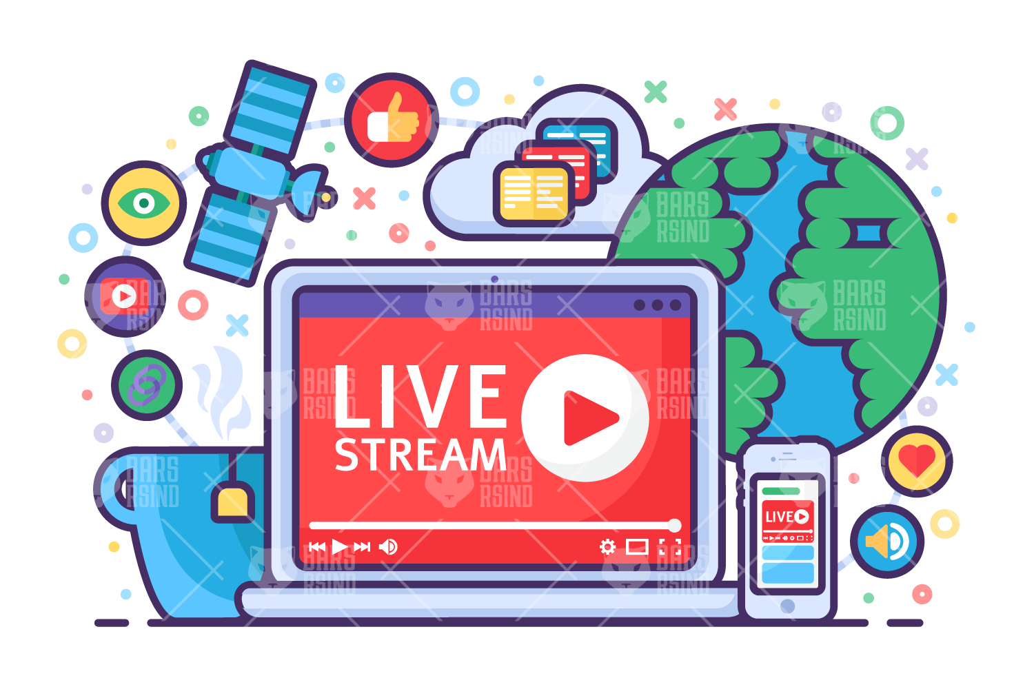 Download Vector "Live Stream Concept Illustration - Vector Image" / Live Stream Concept Illustration - Vector Image - Vector на тему графика live,stream,broadcast,information,button,streaming,player,online,cloud,phone,technology,satellite,internet,world,viewing,play,channel,like,mug,modern