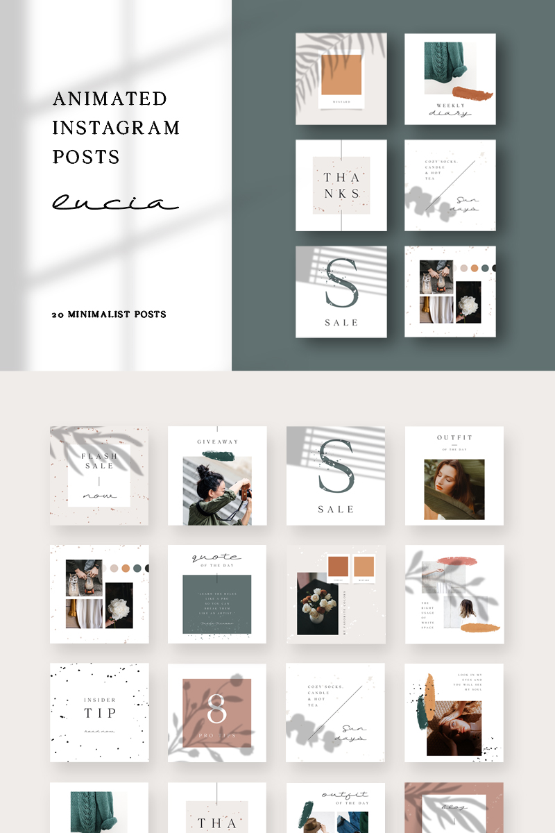 Download Шаблон для соцсетей "Lucia - Instagram Posts Social Media Template" / Lucia - Instagram Posts Social Media Template - Шаблон для соцсетей на тему графика animation animated instagram post posts posting bundle female watercolor watercolour minimalist minimalism shadow leaf fashion lifestyle social media mood board