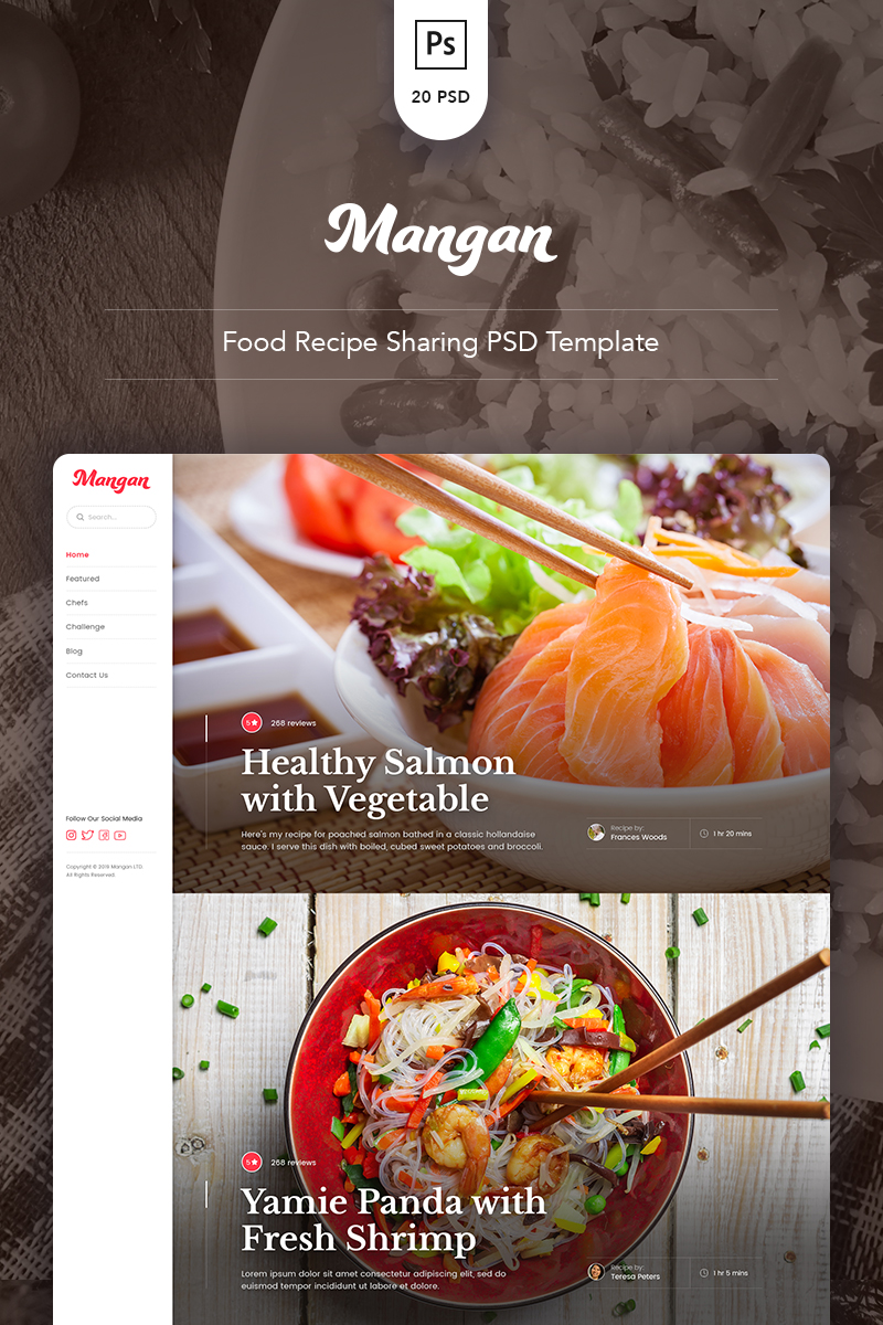 Download PSD шаблон "Mangan - Food Recipe Sharing PSD Template" / Mangan - Food Recipe Sharing PSD Template - PSD шаблон на тему еда и ресторан blog chef clean community food recipe ingredients modern nutrition psd template seasoning ui website design