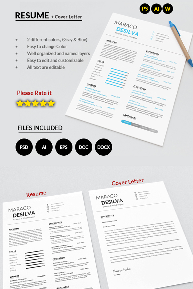 Download Резюме "Maraco Desilva Graphic / Web Designer - Resume Template" / Maraco Desilva Graphic / Web Designer - Resume Template - Резюме на тему графика clean cv resume cover letter creative curriculum vitae design template editable elegant indesign job light portfolio professional word simple typography