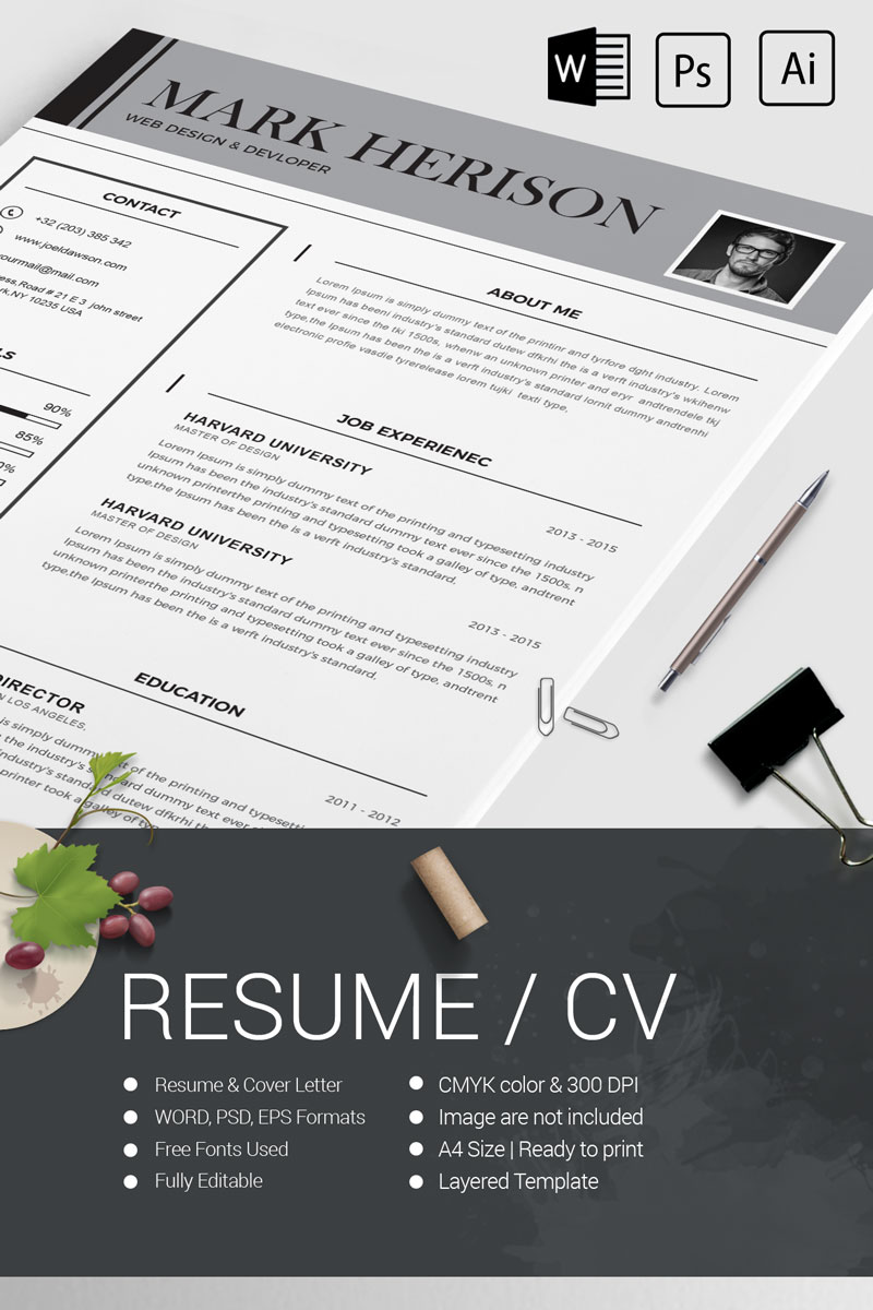 Download Резюме "Mark Herison Resume Template" / Mark Herison Resume Template - Резюме на тему графика 2 page a4 clean cv design elegant resume female feminine infographic letter minimalist modern portfolio professional indesign minimal pages
