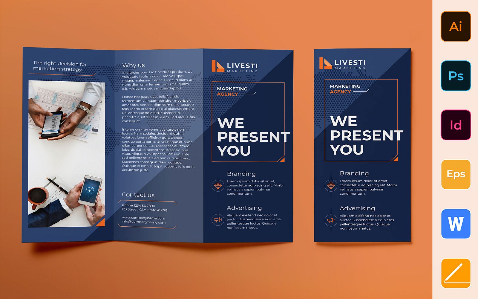 Download Фирменный стиль "Marketing Agency Brochure Trifold - Corporate Identity Template" / Marketing Agency Brochure Trifold - Corporate Identity Template - Фирменный стиль на тему графика brochure,trifold,template,corporate,company,branding,marketing,agency,advertising,strategy,management,promotion,blue,orange,white
