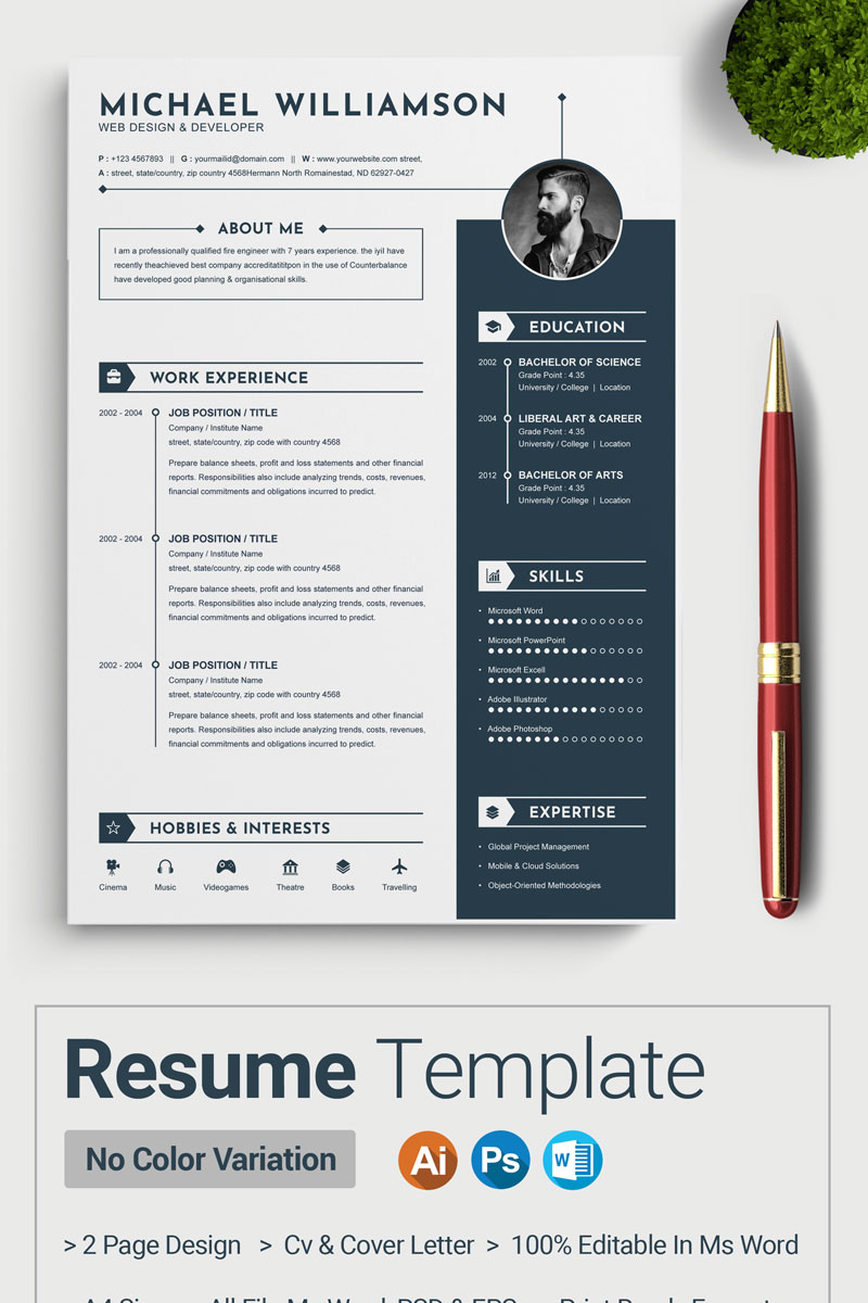 Download Резюме "Michael Williamson Resume Template" / Michael Williamson Resume Template - Резюме на тему графика 2 page a4 clean cv design elegant resume female feminine infographic letter minimalist modern portfolio professional indesign minimal pages