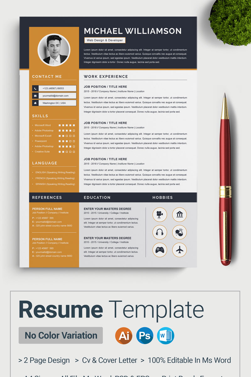 Download Резюме "Michael Williamson Resume Template" / Michael Williamson Resume Template - Резюме на тему графика 2 page a4 clean cv design elegant resume female feminine infographic letter minimalist modern portfolio professional indesign minimal pages