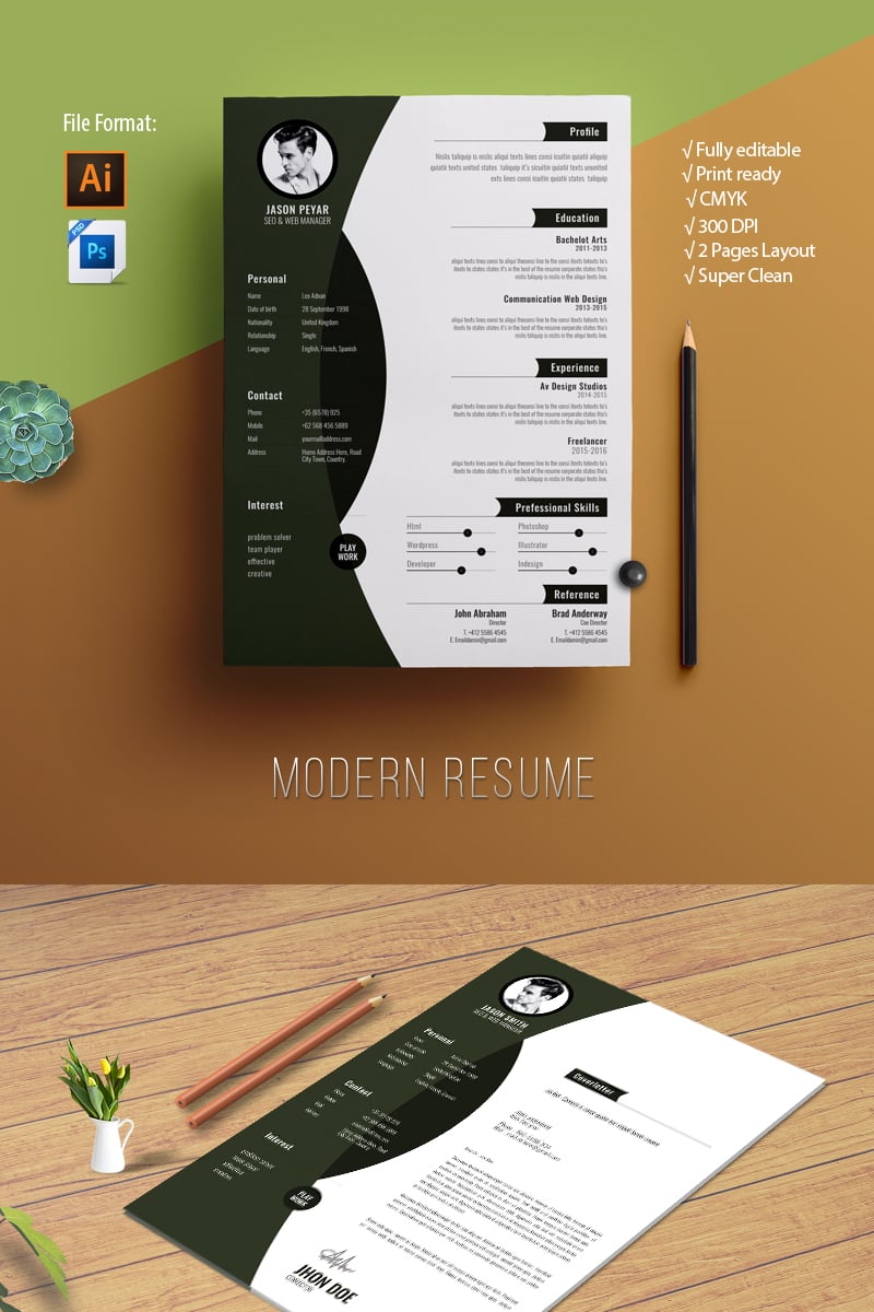 Download Резюме "Modern Resume Template" / Modern Resume Template - Резюме на тему графика resume,template,cv,design,writing,modern,professional,minimal,clean,word,psd,photoshop,mac,pages,simple,designer,developer,toys,instant,download