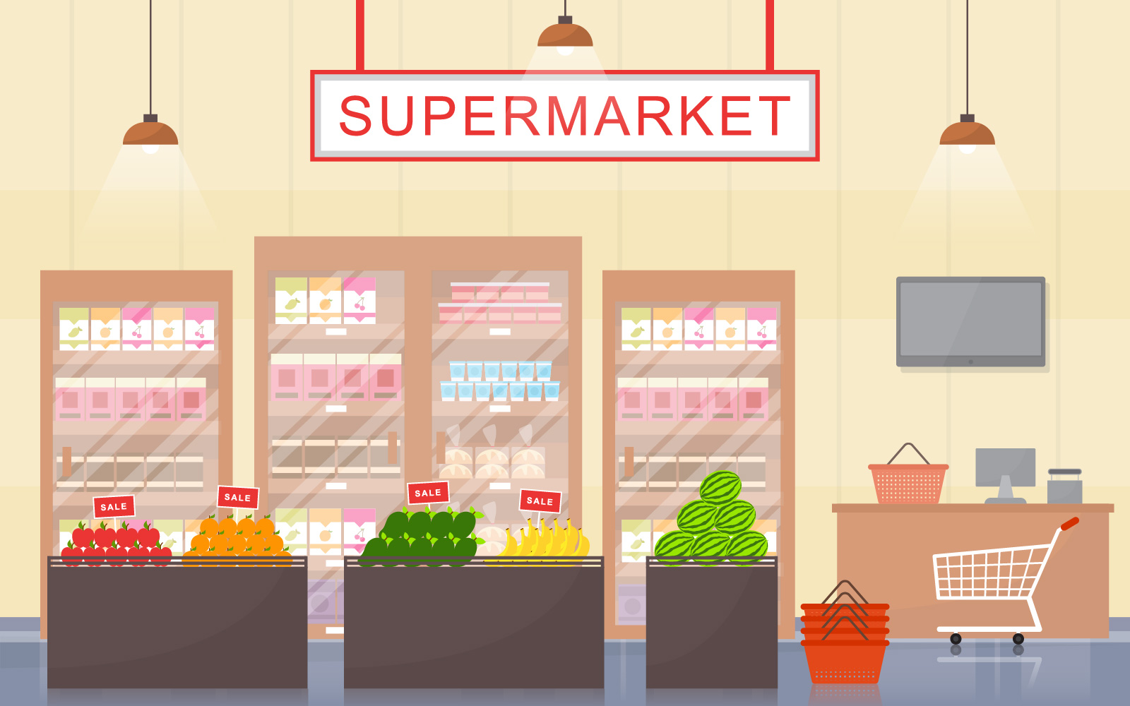 Download Иллюстрация "Modern Retail Grocery - Illustration" / Modern Retail Grocery - Illustration - Иллюстрация на тему графика supermarket,grocery,shelf,store,retail,shop,mall,interior,flat,illustration,vector,market,sale,fruit,milk,background,big,empty,groceries,showcase