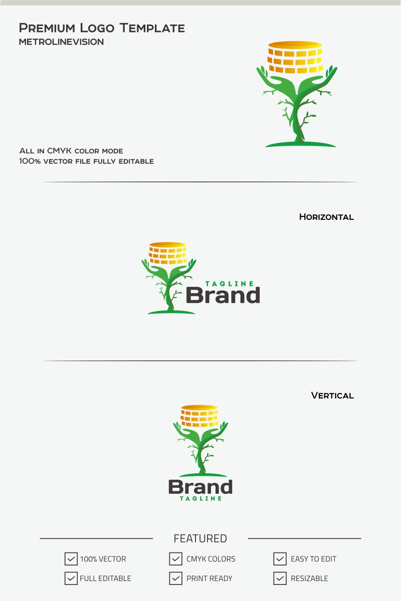 Download Шаблон логотипа "Money Tree Logo Template" / Money Tree Logo Template - Шаблон логотипа на тему графика money cupon coins coin finance agency app beauty brand business colored company corporate creative design designer eco ecology elegant forest,capital,logo,investment,tree,hand,help,foundation