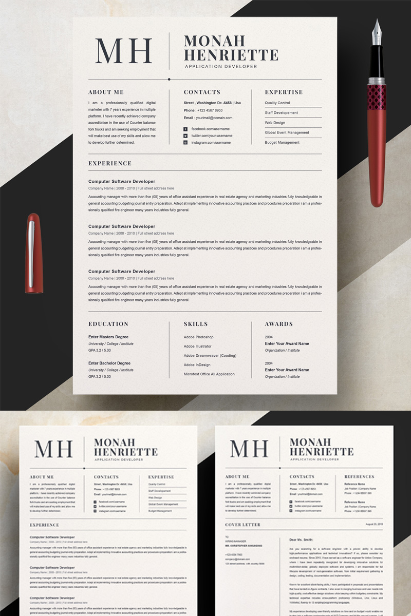 Download Резюме "Monha Resume Template" / Monha Resume Template - Резюме на тему графика 1 page cv resume 2 3 apple clean cover letter curriculum vitae template illustrator eps mac pages microsoft word minimal