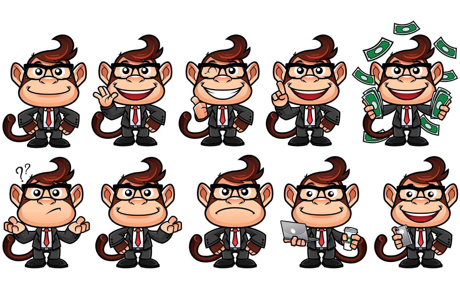Download Иллюстрация "Monkey Business Set - Illustration" / Monkey Business Set - Illustration - Иллюстрация на тему графика monkey,business,businessman,business monkey,monkey business,money,cash,rich,wealth,cartoon,set,pack,collection,pose,mascot,symbol,suit,tie,costume,manager