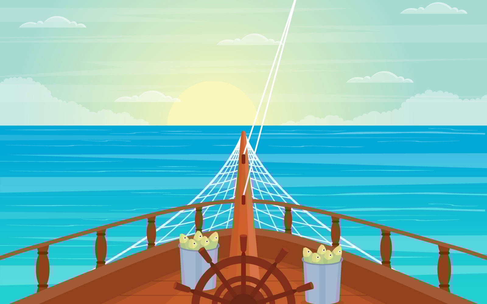 Download Иллюстрация "Morning Sunrise Ocean - Illustration" / Morning Sunrise Ocean - Illustration - Иллюстрация на тему графика ship,cruise,deck,vector,seagull,background,ocean,passenger,sea,style,summer,view,landscape,front,adventure,sailing,horizon,cloud,season,day