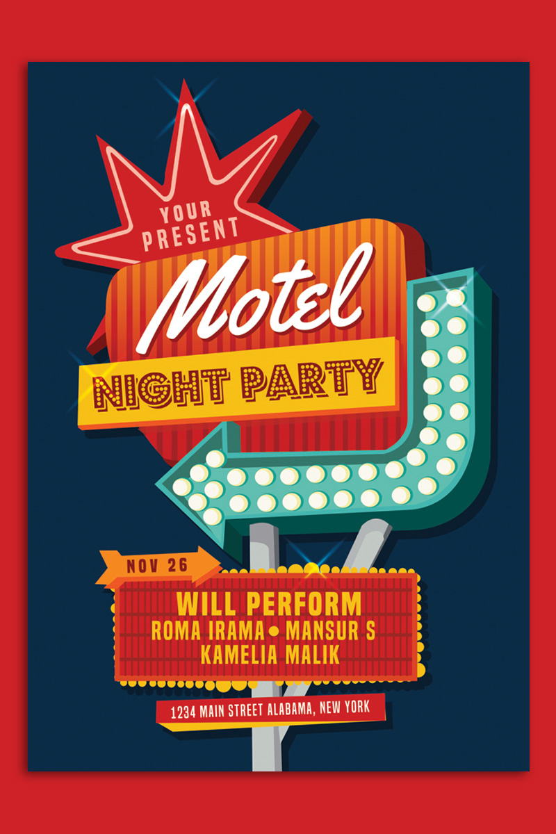 Download Фирменный стиль "Motel Sign Party Flyer - Corporate Identity Template" / Motel Sign Party Flyer - Corporate Identity Template - Фирменный стиль на тему графика alternative artist band bar concert design event festival flyer gig grunge indie light lights motel music neon old party post