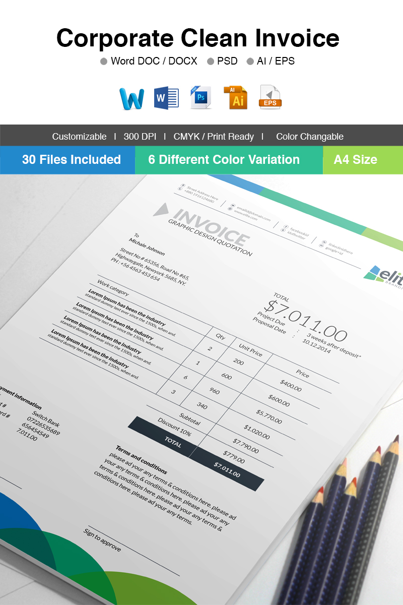 Download Фирменный стиль "MS Word Clean Invoice - Corporate Identity Template" / MS Word Clean Invoice - Corporate Identity Template - Фирменный стиль на тему графика invoice template design ms word psd eps clean bundle simple modern business cash memo a4 automatic bill creative excel indesign