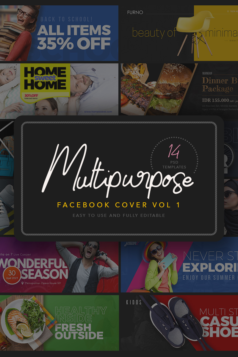 Download Шаблон для соцсетей "Multipurpose Facebook Cover Templates for Social Media" / Multipurpose Facebook Cover Templates for Social Media - Шаблон для соцсетей на тему графика facebook cover template music event food multipurpose restaurant fashion furniture travel holiday summer bike bicycle sofa home shoes kids clothing