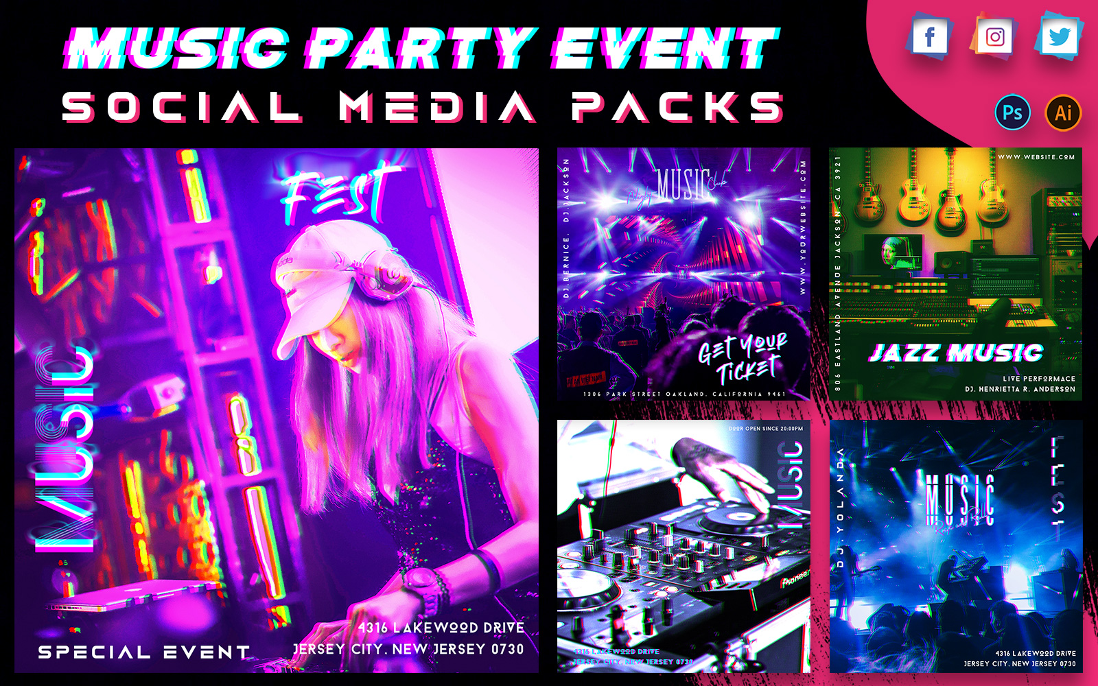Download Шаблон для соцсетей "Music Event Promo Social Media Packs" / Music Event Promo Social Media Packs - Шаблон для соцсетей на тему графика music,promotion,social,media,pack,post,instagram,twitter,facebook,story,cover,instagrampost,instagramstory,template,offer