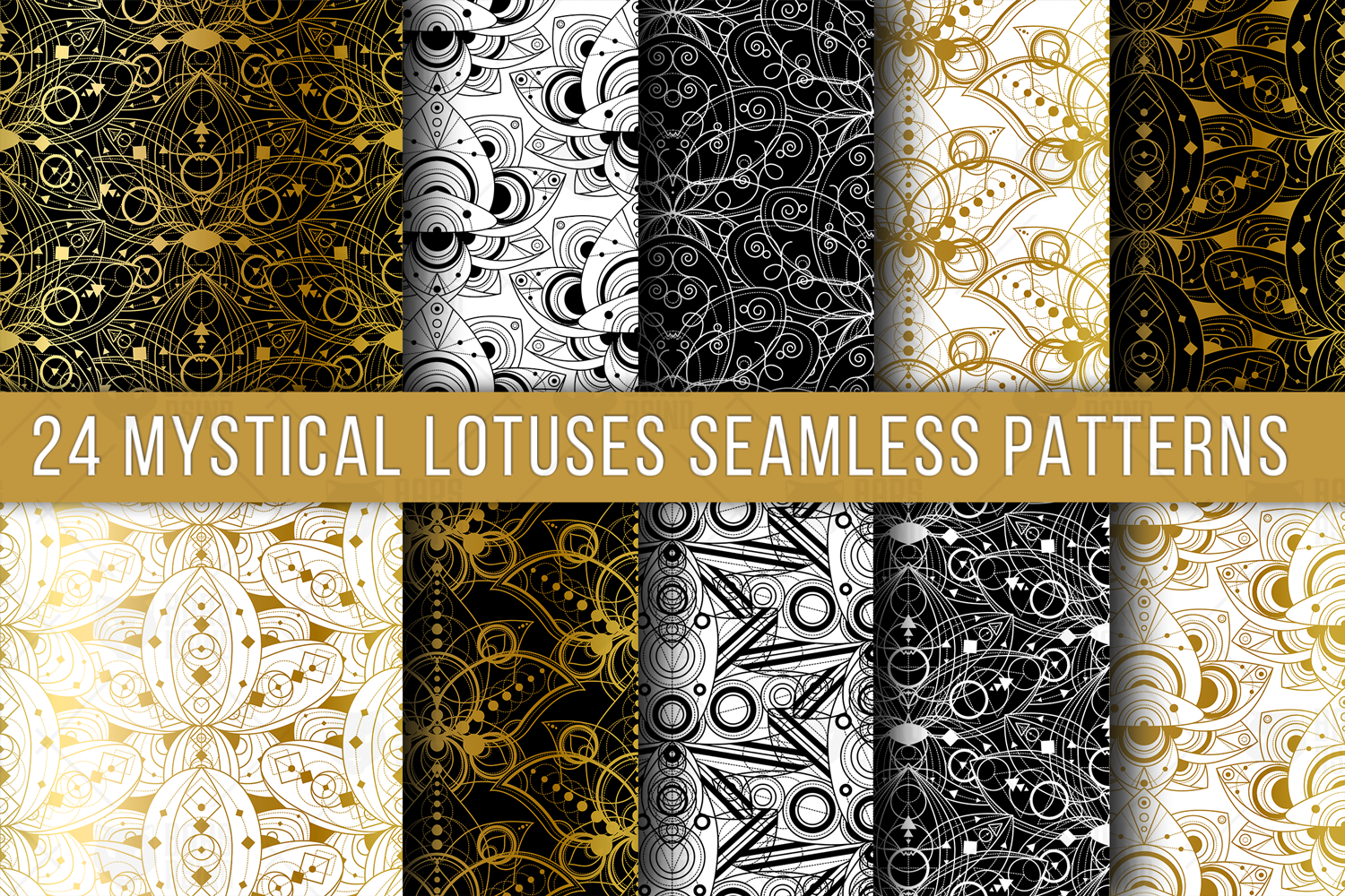 Download Pattern "Mystical Lotuses Seamless Set Pattern" / Mystical Lotuses Seamless Set Pattern - Pattern на тему графика vintage,illustration,design,template,retro,fashion,decorative,ornamental,ink,vector,thin,floral,boho,texture,fabric,round,art,tattoo,sun,hand,abstract,shapes,ornament,magic,religious,decorati