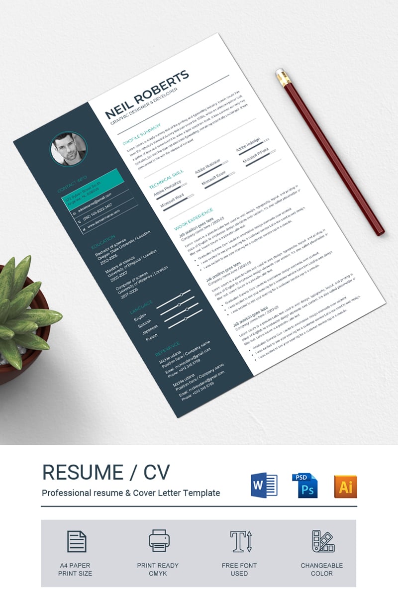 Download Резюме "Neil Resume Template" / Neil Resume Template - Резюме на тему графика a4 clean resume cv doc elegant template indesign infographic modern professional creative design minimal pages portfolio word us letter