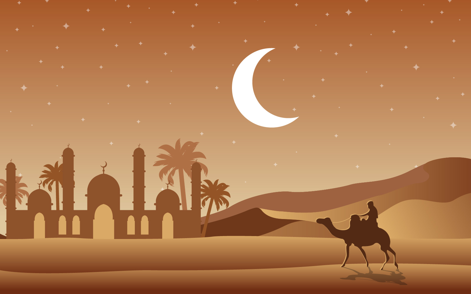 Download Иллюстрация "Night Desert Islamic Mosque Palm Tree - Illustration" / Night Desert Islamic Mosque Palm Tree - Illustration - Иллюстрация на тему графика night,desert,islamic,mosque,islam,moslem,muslim,date,palm,tree,camel,arabian,landscape,illustration,beautiful,mountain,arab,horizon,middle,east