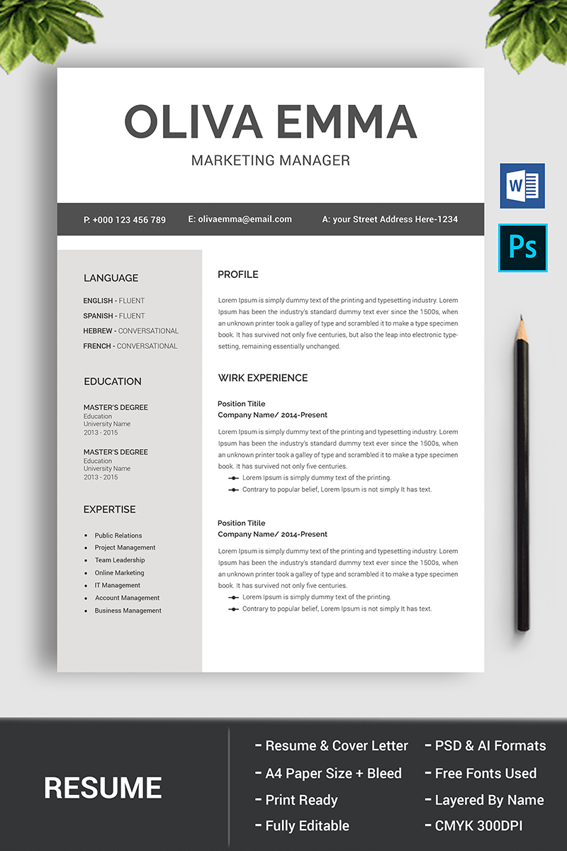 Download Резюме "Oliva Emma Resume Template" / Oliva Emma Resume Template - Резюме на тему графика a4,clean,resume,cover,letter,creative,cv,design,document,docx,elegant,employment,infographic,minimalist,modern,ms,word,professional,psd,template