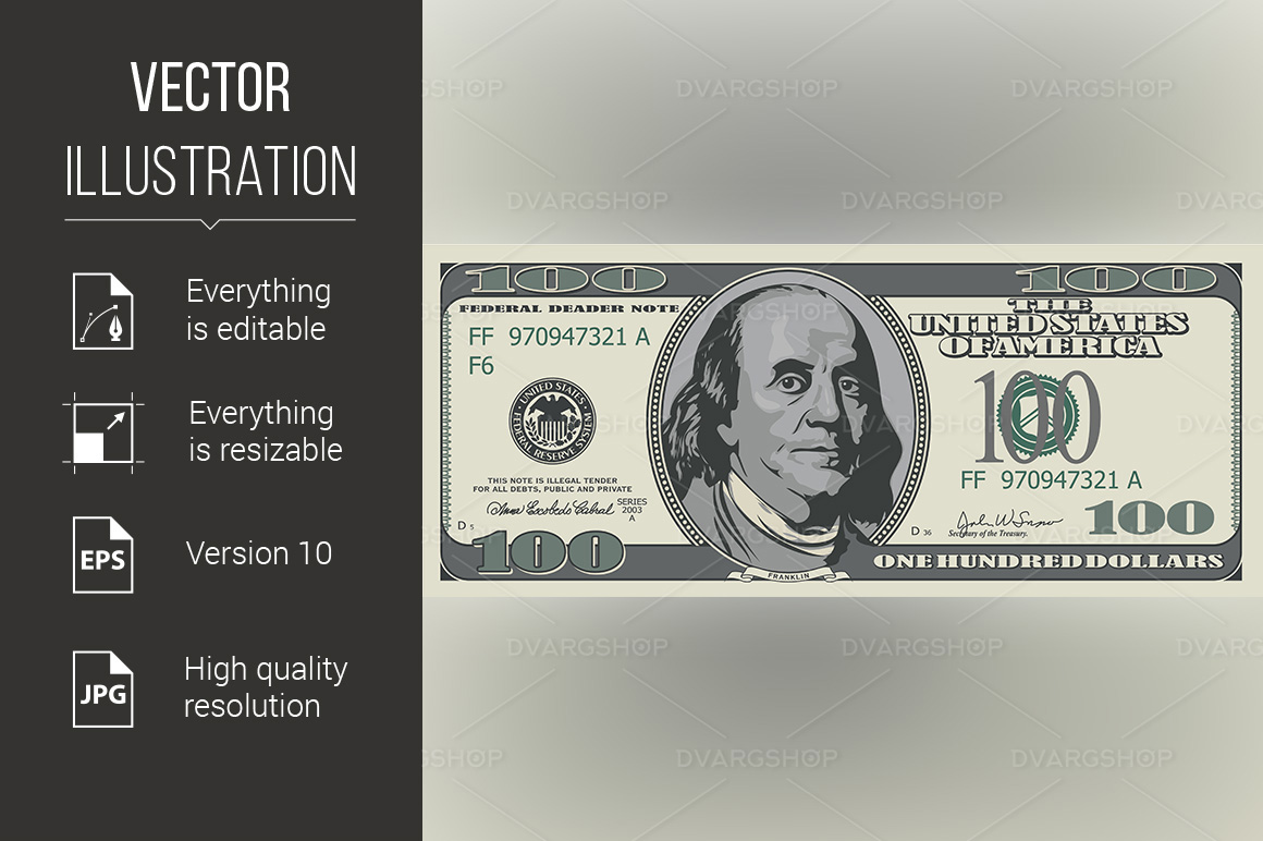 Download Vector "One Hundred Dollars - Vector Image" / One Hundred Dollars - Vector Image - Vector на тему графика one,hundred,background,dollars,dollar,isolated,white,valuable,american,rich,value,over,usa,finance,united,currency,financial,prosperity,economics,save