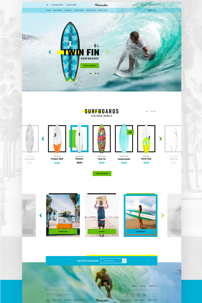 Download PSD шаблон "Online shop for surfing PSD Template" / Online shop for surfing PSD Template - PSD шаблон на тему развлечения online shop surf boards beach sea ocean summer man women sport wave
