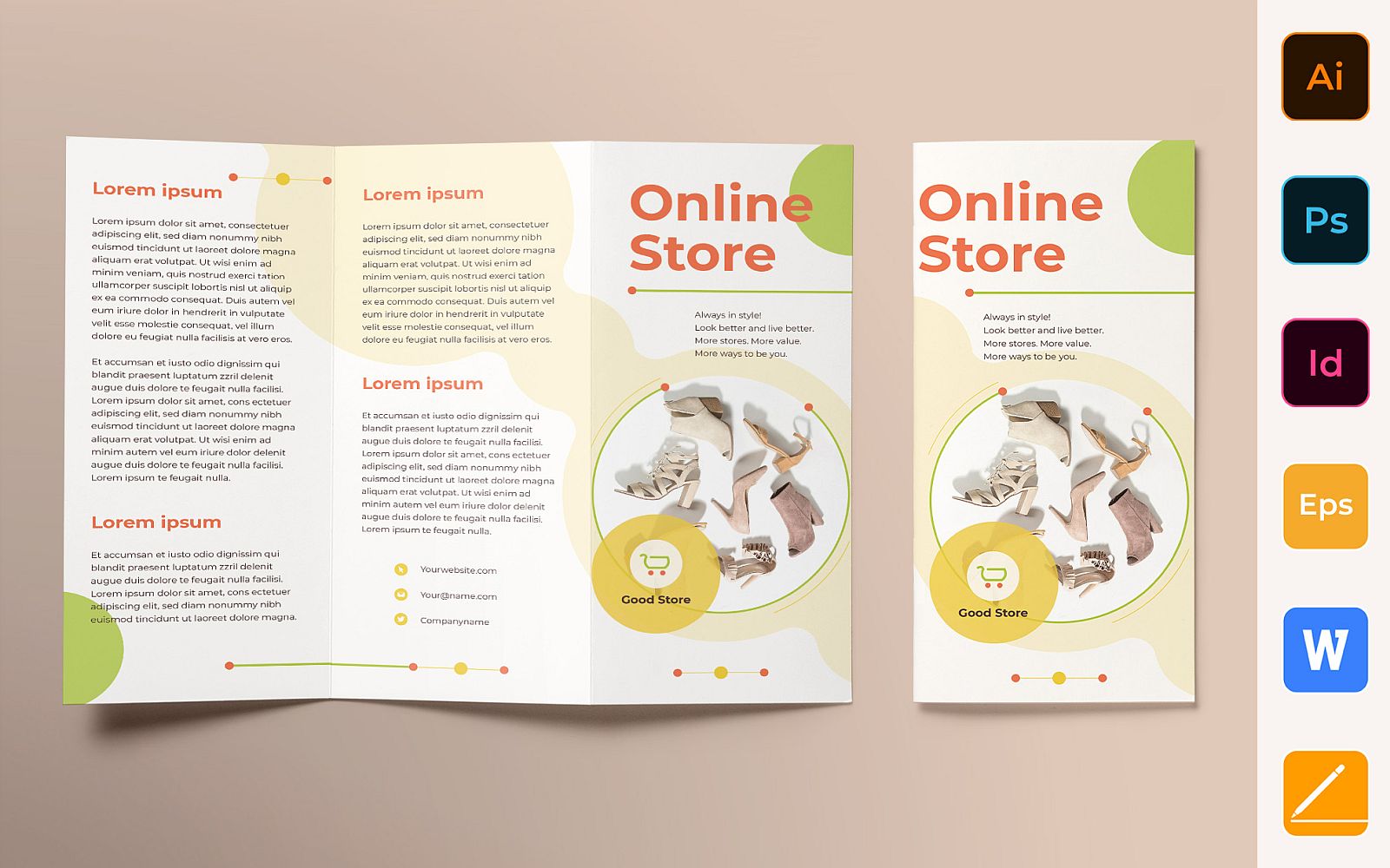 Download Фирменный стиль "Online Store Brochure Trifold - Corporate Identity Template" / Online Store Brochure Trifold - Corporate Identity Template - Фирменный стиль на тему графика brochure,trifold,template,corporate,company,branding,online,store,shop,shopping,ecommerce,boutique,green,yellow,pastel