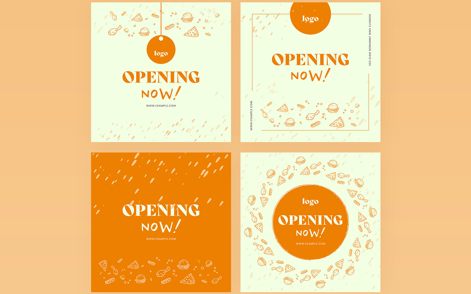 Download Фирменный стиль "Opening Now Food Social Media Layout Set - Corporate Identity Template" / Opening Now Food Social Media Layout Set - Corporate Identity Template - Фирменный стиль на тему графика social media post,food,restaurant,meal,open,post,instagram,orange,trend,holiday food