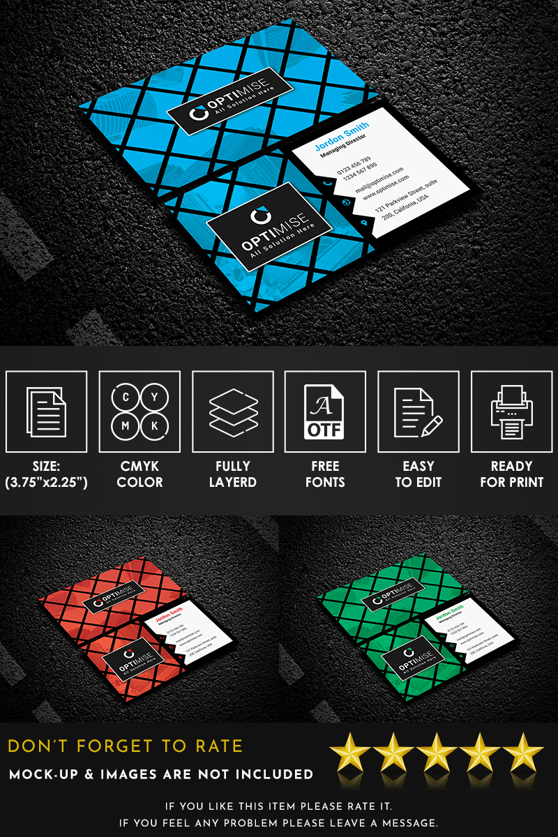 Download Фирменный стиль "Optimise Agency Business Card - Corporate Identity Template" / Optimise Agency Business Card - Corporate Identity Template - Фирменный стиль на тему графика business card agency personal portfolio print printready modern clean minimal visiting contact information red blue green studio company corporate