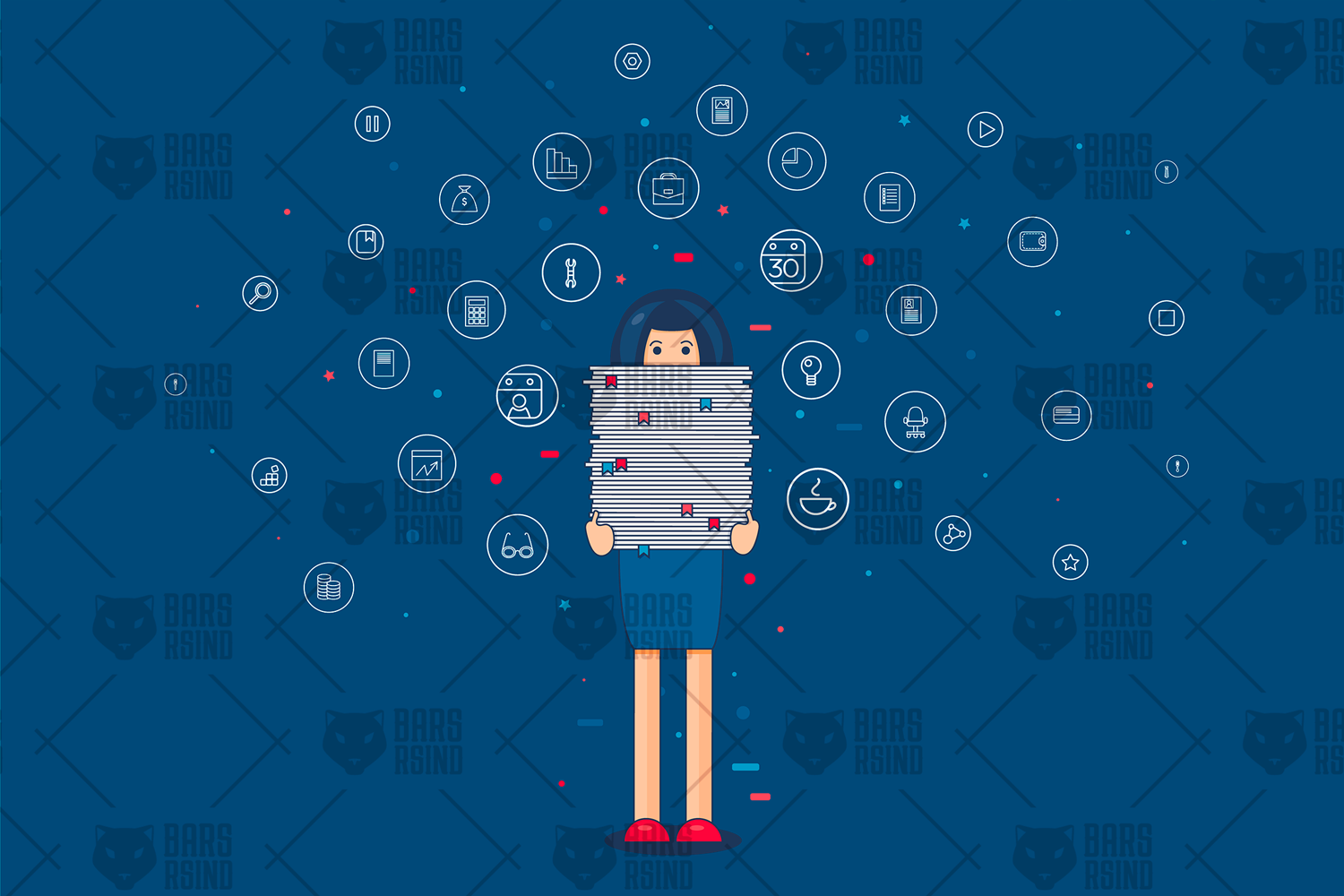 Download Иллюстрация "Overworked Employee - Illustration" / Overworked Employee - Illustration - Иллюстрация на тему графика vector,woman,female,flat,business,manager,work,bookmark,cartoon,people,office,paper,humor,concept,document,file,conceptual,person,personnel,problem,stress,tired,career,employee,worker,job,tas