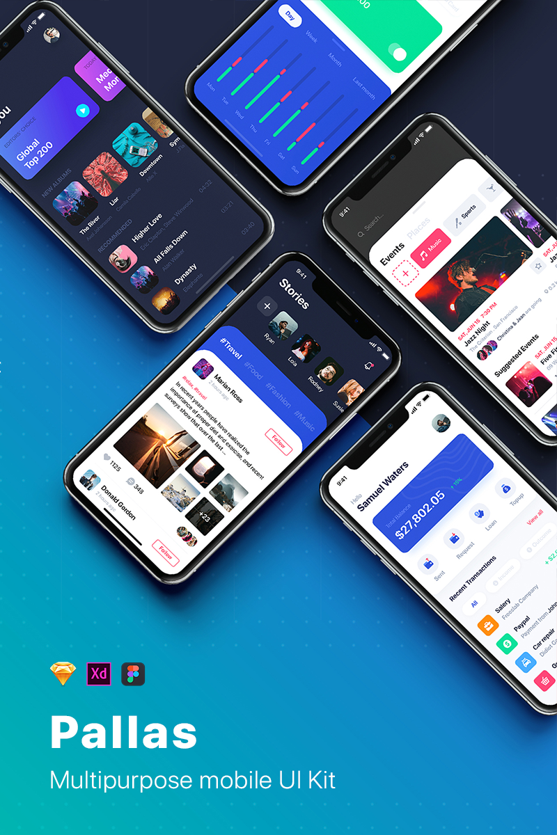 Download UI элементы "Pallas Mobile UI Kit " / Pallas Mobile UI Kit - UI элементы на тему графика app ui social statistics articles interface material kit mobile login profile map tracking menu boarding theme template components prototype multipurpose