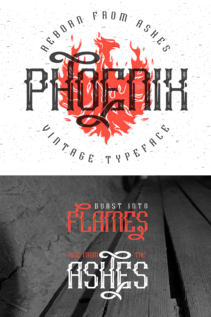 Download Шрифт "Phoenix typeface Font" / Phoenix typeface Font - Шрифт на тему графика font,type,typeface,phoenix,burning,ashes,vintage,retor,rusty,glyphs,bird,grunge,tatoo,gothic,swashes,flame,reborn,print,symbol,illustration
