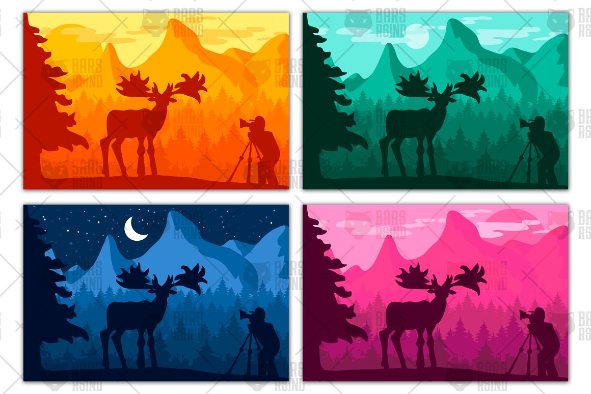 Download Vector "Photographer Photographs Deer - Vector Image" / Photographer Photographs Deer - Vector Image - Vector на тему графика wildlife,wild,photographer,photo,deer,reindeer,moose,green,forest,scene,landscape,hill,animal,photography,travel,mountain,land,sun,sunset,night