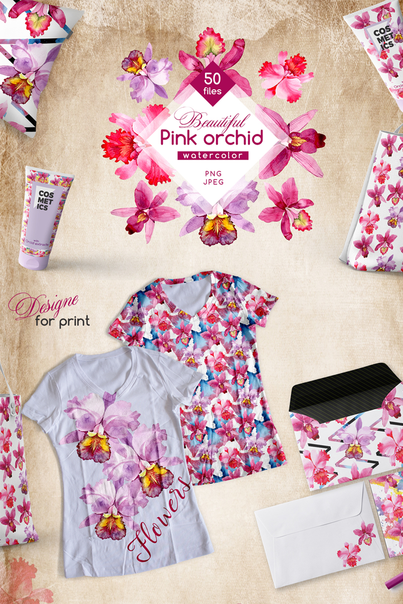 Download Иллюстрация "Pink Orchid PNG Watercolor Flower Set - Illustration" / Pink Orchid PNG Watercolor Flower Set - Illustration - Иллюстрация на тему графика watercolor illustration watercolour drawing background textile colorful vintage paint purple orchid beautiful flower decoration petal wildflower isolated rustic leaf foliage