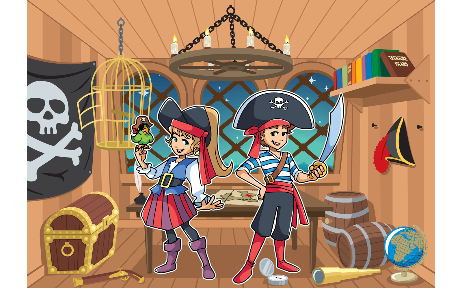 Download Иллюстрация "Pirate Kids in Cabin - Illustration" / Pirate Kids in Cabin - Illustration - Иллюстрация на тему графика boy,girl,children,pirate,costume,party,fun,kid,child,friend,couple,character,carnival,best friend,cabin,berth,room,captain,ship,pirate ship