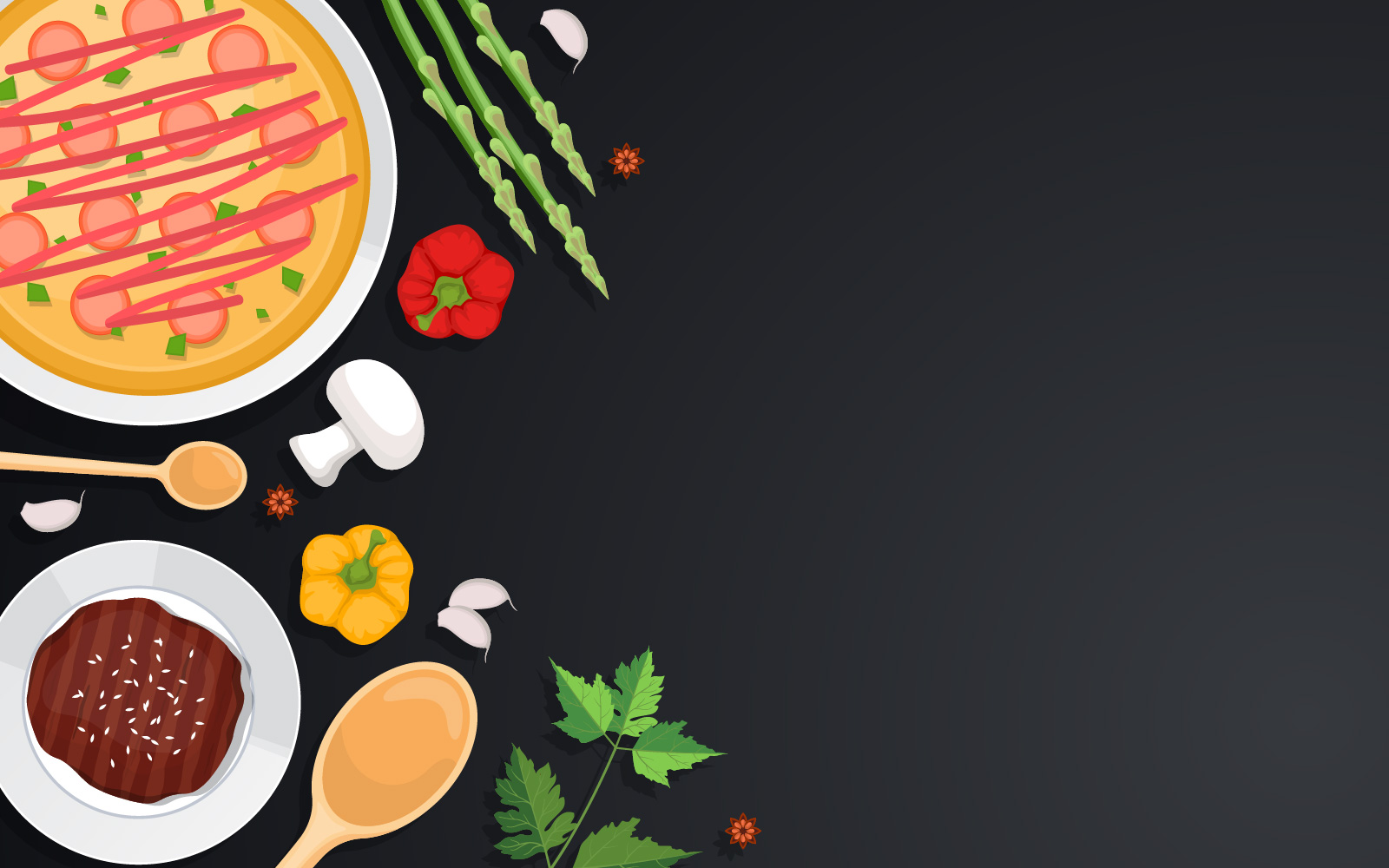 Download Иллюстрация "Pizza Vegetable Cooking - Illustration" / Pizza Vegetable Cooking - Illustration - Иллюстрация на тему графика pizza,vegetables,cooking,black,table,kitchen,backdrop,illustration,vector,plate,tea,spoon,ladle,garlic,meat,pepper,bell,red,yellow,paprika