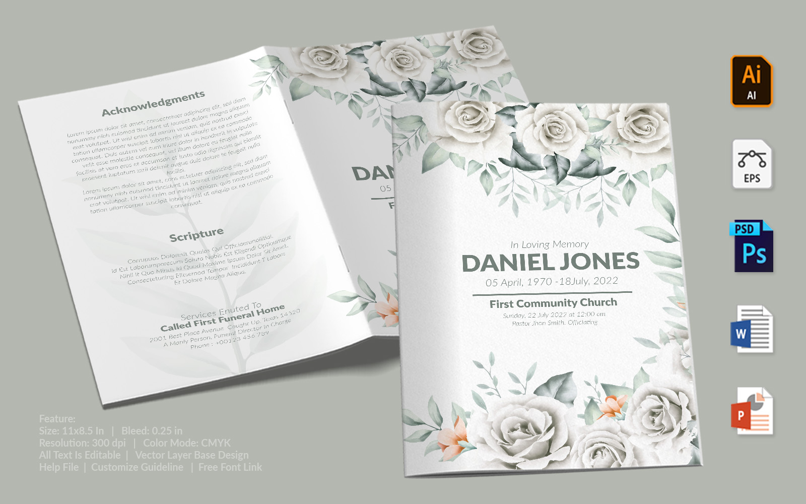Download Фирменный стиль "Printable Funeral Program - Corporate Identity Template" / Printable Funeral Program - Corporate Identity Template - Фирменный стиль на тему графика printable,funeral,memorial,obituary,bituary,program,service,template,brochure,card,custom,photoshop,illuastator,vector,word,powerpoint,psd,ai,eps,docx