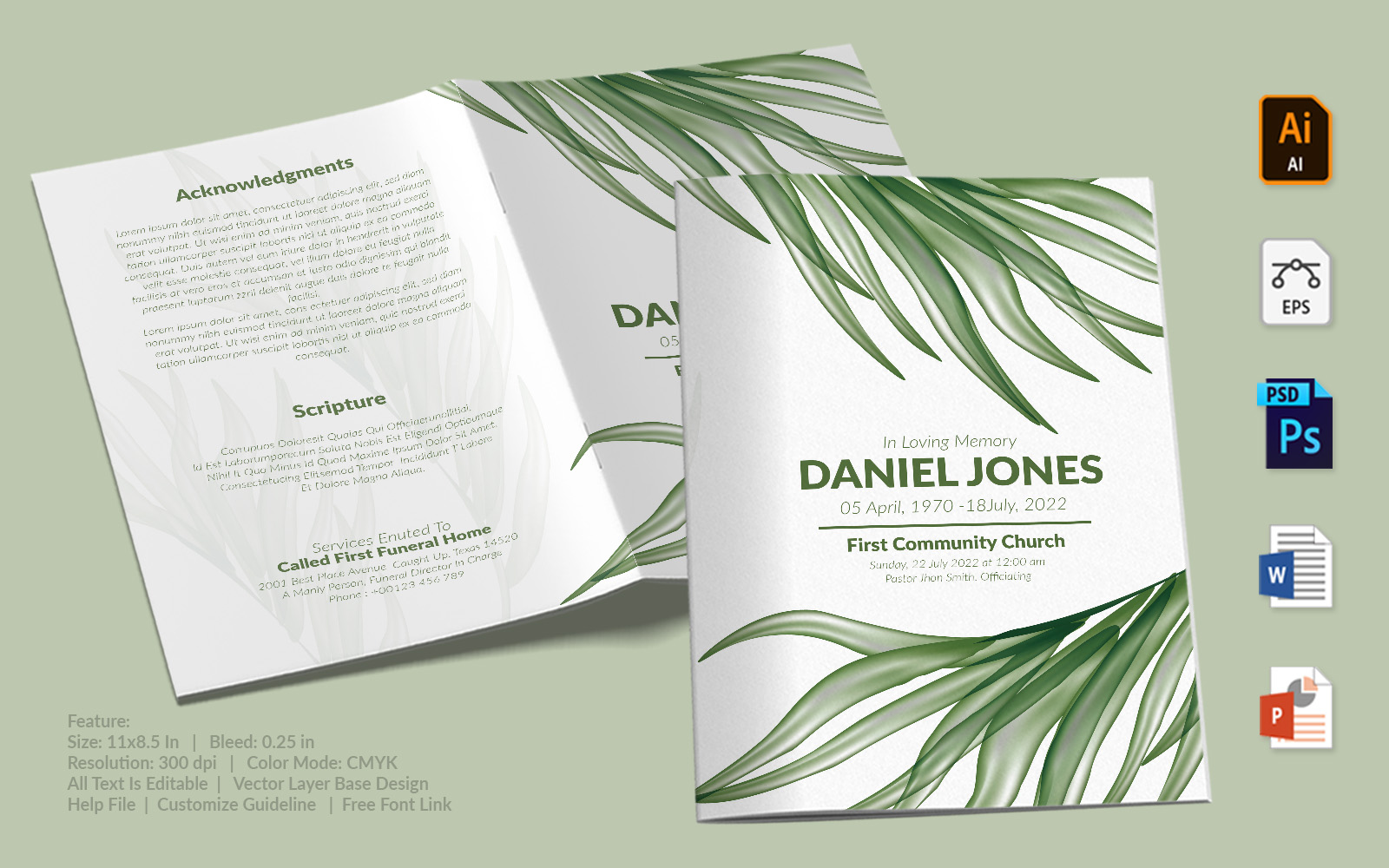 Download Фирменный стиль "Printable Funeral Program - Corporate Identity Template" / Printable Funeral Program - Corporate Identity Template - Фирменный стиль на тему графика printable,funeral,memorial,obituary,bituary,program,service,template,brochure,card,custom,photoshop,illuastator,vector,word,powerpoint,psd,ai,eps,docx