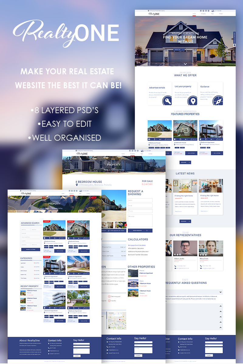 Download PSD шаблон "RealtyOne PSD Template" / RealtyOne PSD Template - PSD шаблон на тему агентство недвижимости clean modern real estate properties easy customizable layered