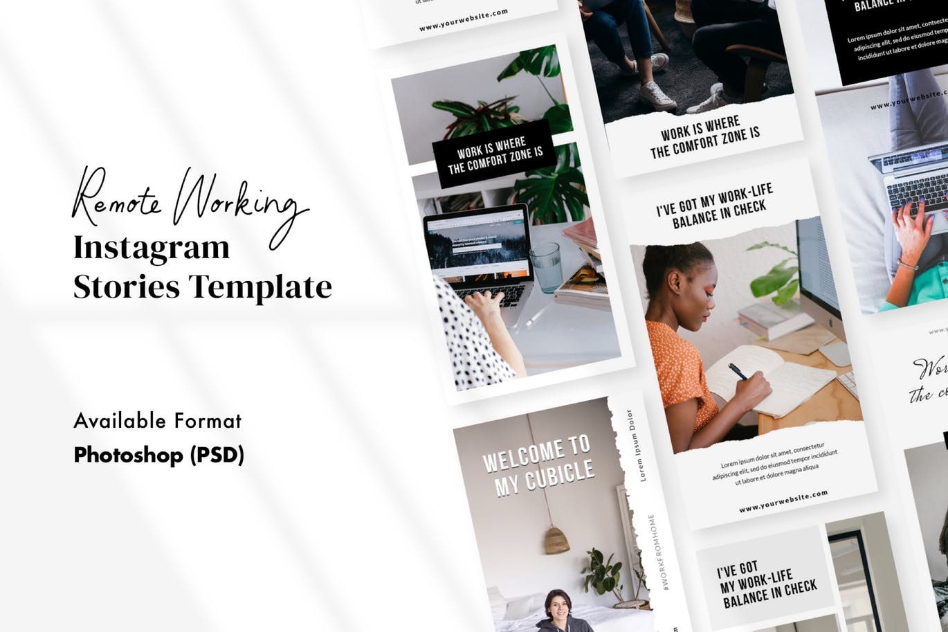 Download Шаблон для соцсетей "Remote Work Instagram Stories Template PSD for Social Media" / Remote Work Instagram Stories Template PSD for Social Media - Шаблон для соцсетей на тему графика instagram,story,stories,fashion,promotion,elegant,beauty,modern,psd,shop,company,corporate,photoshop
