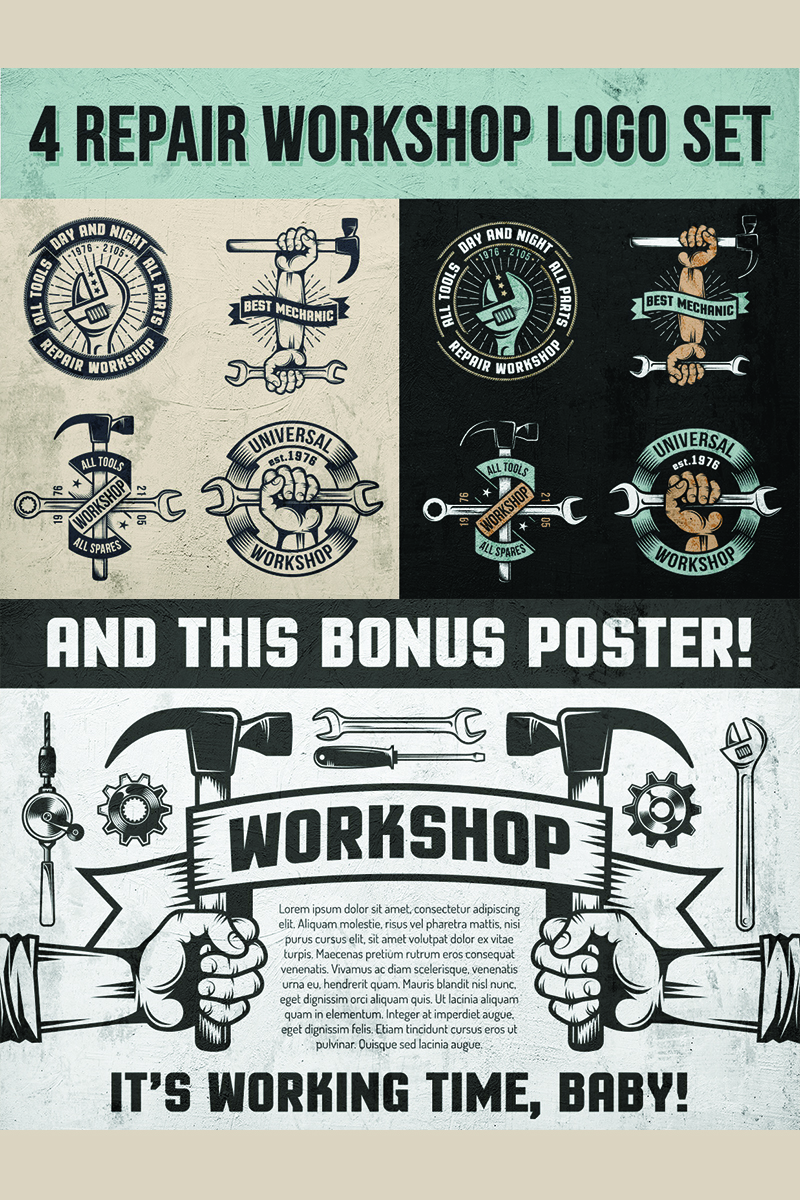 Download Иллюстрация "Repair Workshop Logo set - Illustration" / Repair Workshop Logo set - Illustration - Иллюстрация на тему графика emblem badge label illustration banner professional poster stamp ribbon symbol
