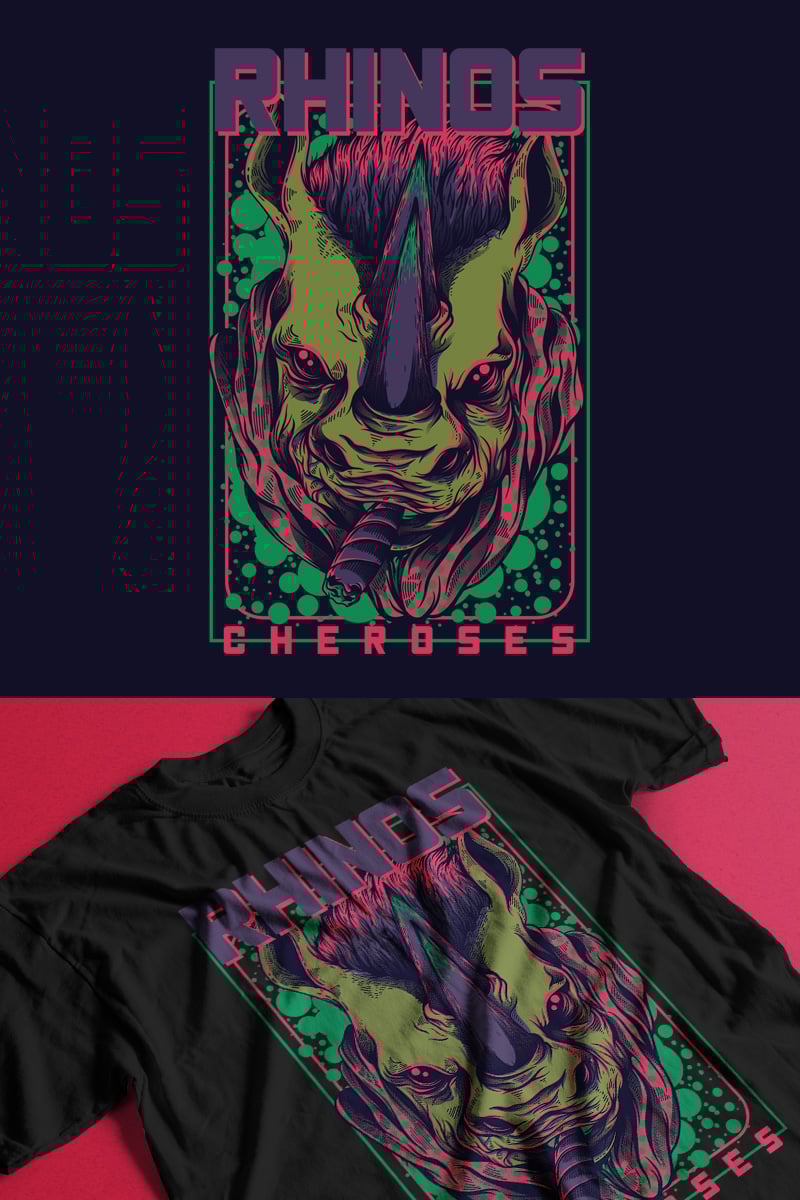 Download T-shirt Design "Rhinos Cheroses - T-shirt Design" / Rhinos Cheroses - T-shirt Design - T-shirt Design на тему графика illustration t-shirt design artwork apparel merch cartoon events fashion graphics poster mascot festival animal rhino cigarettes funky color synthwave music